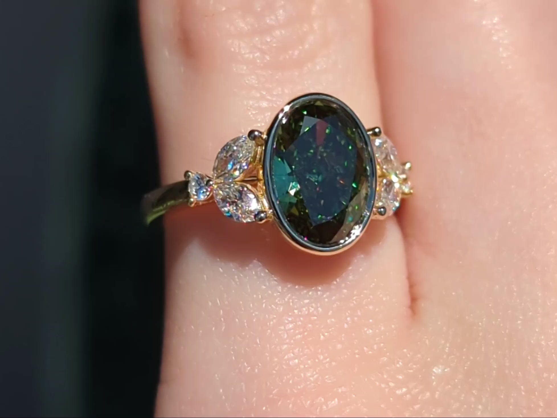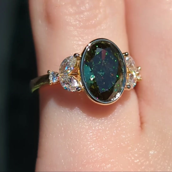 Mirabelle Ring: bezel set 2 ct oval lab diamond with marquise and round side stones